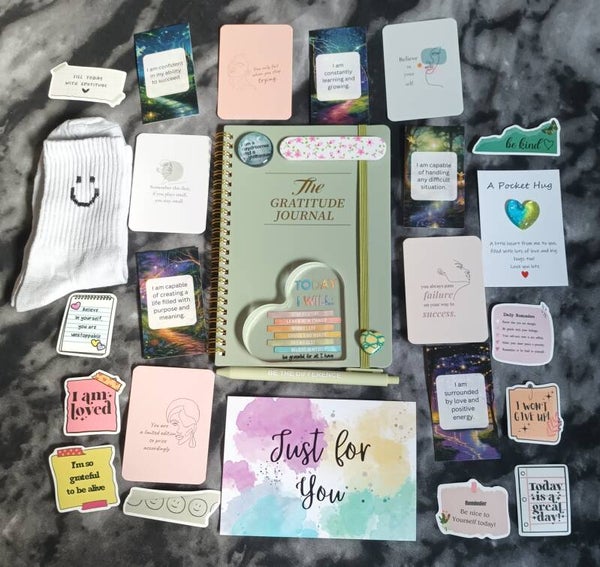 Treat yourself or a loved one to a box of positivity, select your type of journal: Mental health, self care or gratitude and then inside your box alongside your journal you will find a pair of socks, a pen, a magnet, a nail file, a pocket hug or heart, an acrylic sign, 10 positive affirmations cards, 10 stickers and a hand written postcard.
